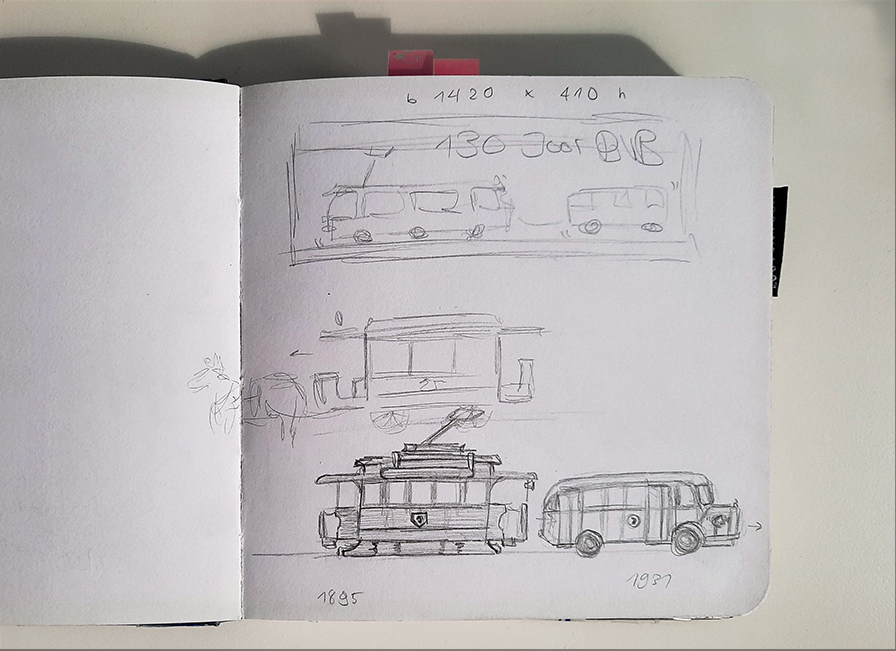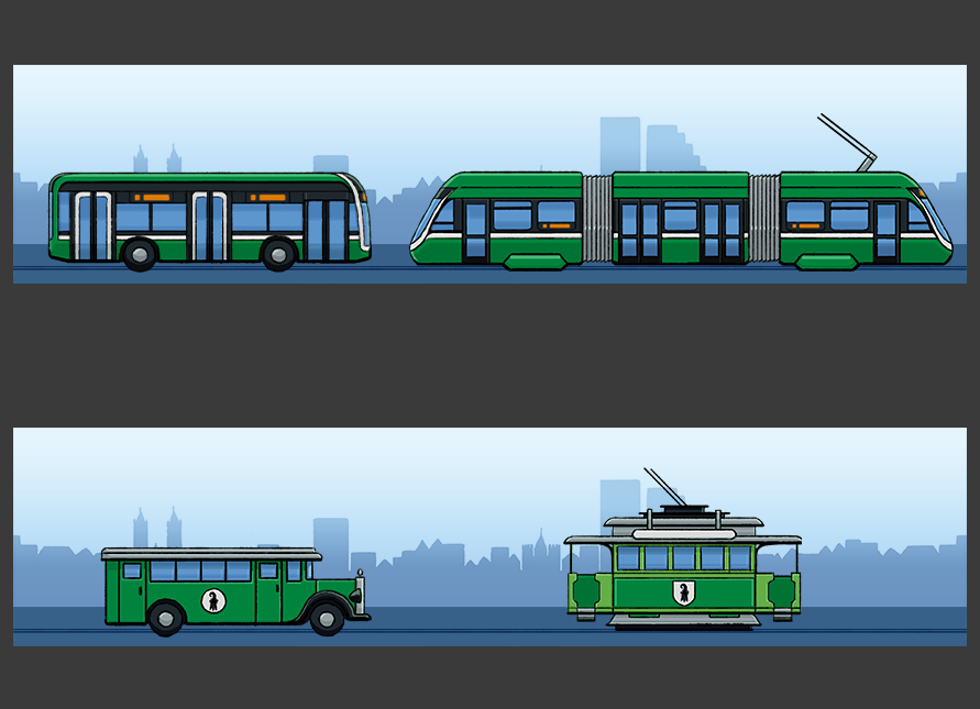 Dazu habe ich eine Szene mit Tram und Bus, gestaltet und Animiert, die zwischen einem antiken und dem heutigen Aussehen der Fahrzeuge wechselt.
