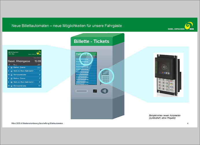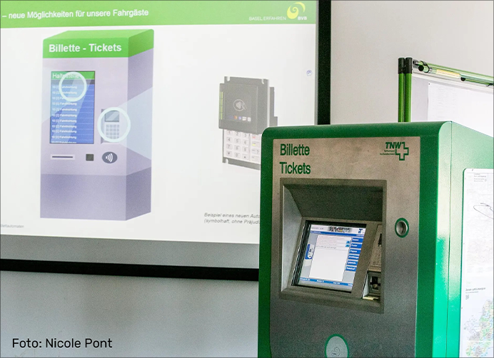 Die BVB kündigte in einer Medienkonferenz die Anschaffung neuer Billetautomaten an. Ich erstellte dazu eine Grafik, an der sich die zukünftigen Funktionen aufzeigen liessen. Dabei war es wichtig,