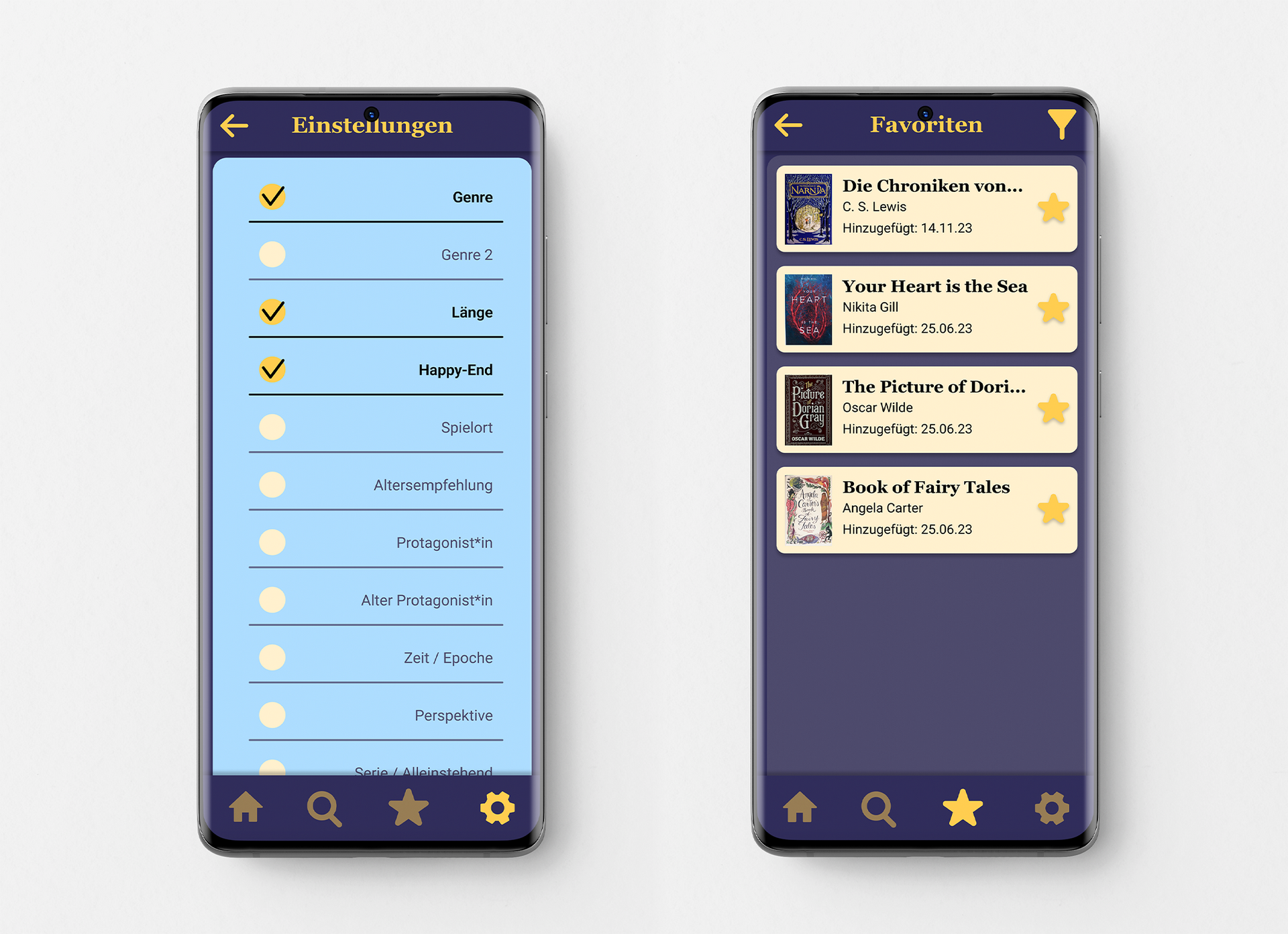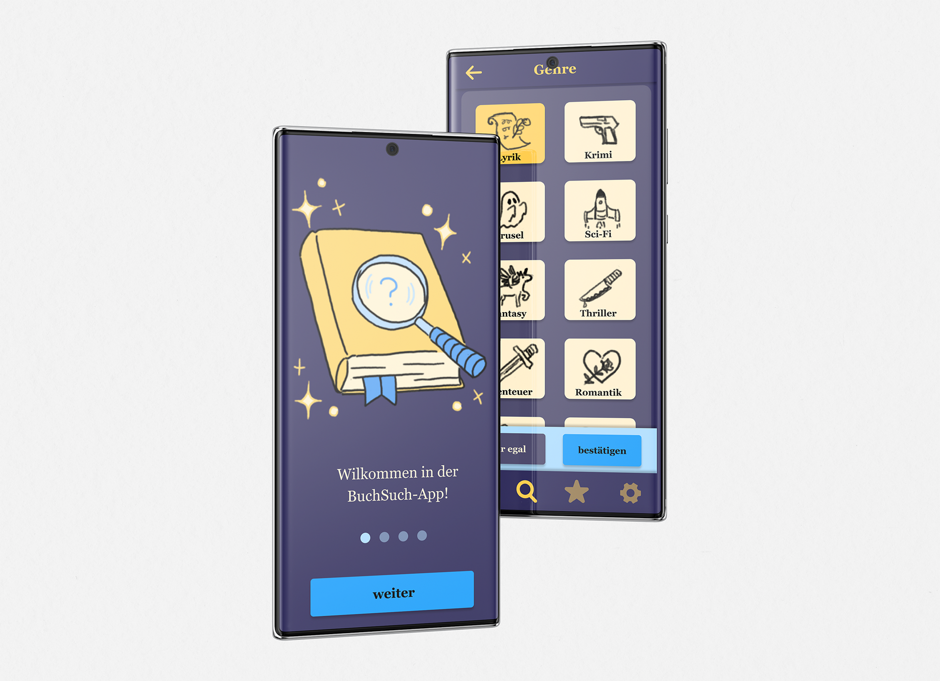 Das Probe-Projekt für die IPA in der Berufsschule, wobei wir die Aufgabe hatten, eine Mobile-App mit einem Soforthilfe-Konzept zu erarbeiten. Ich entschied mich dazu, eine App zu erfinden, die einem mithilfe mehrerer Suchfilter genau das richtige Buch vorschlägt, das man als nächstes lesen möchte.
