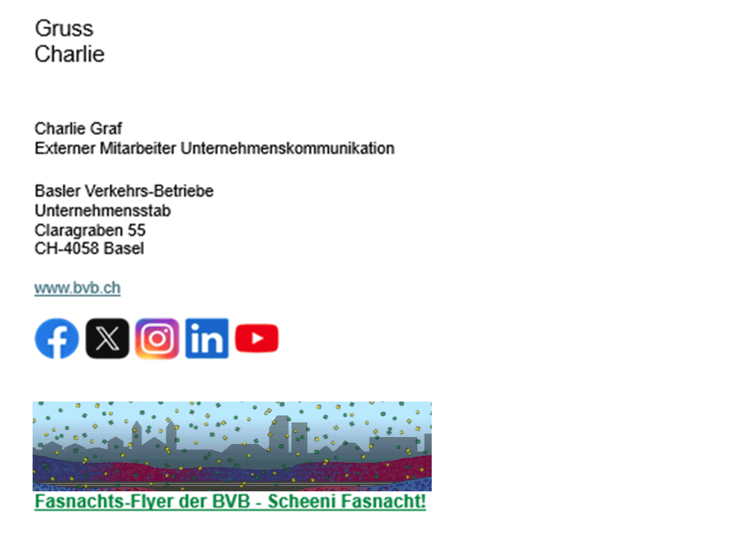 Zum 130-jährigen Jubiläum der BVB zierte ein animiertes Banner die E-Mail-Signatur der BVB.