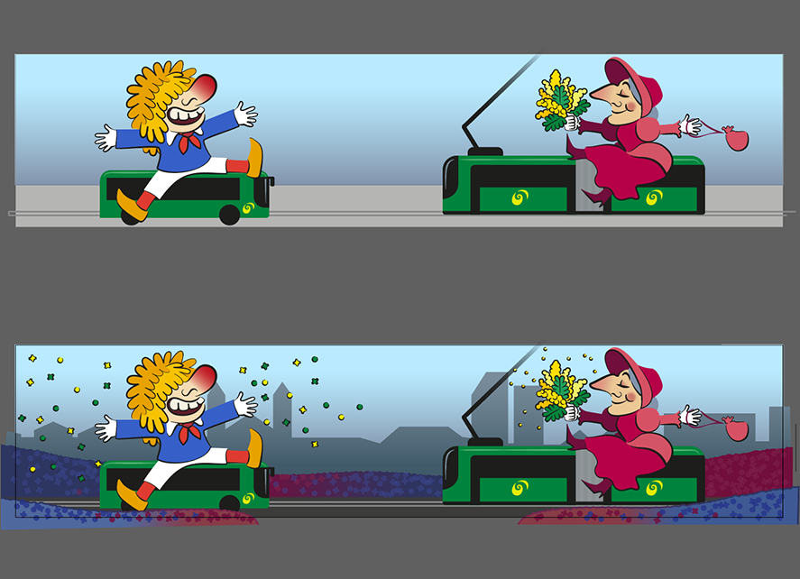 Dazu habe ich eine Szene mit Tram und Bus, gestaltet und Animiert, die zwischen einem antiken und dem heutigen Aussehen der Fahrzeuge wechselt.